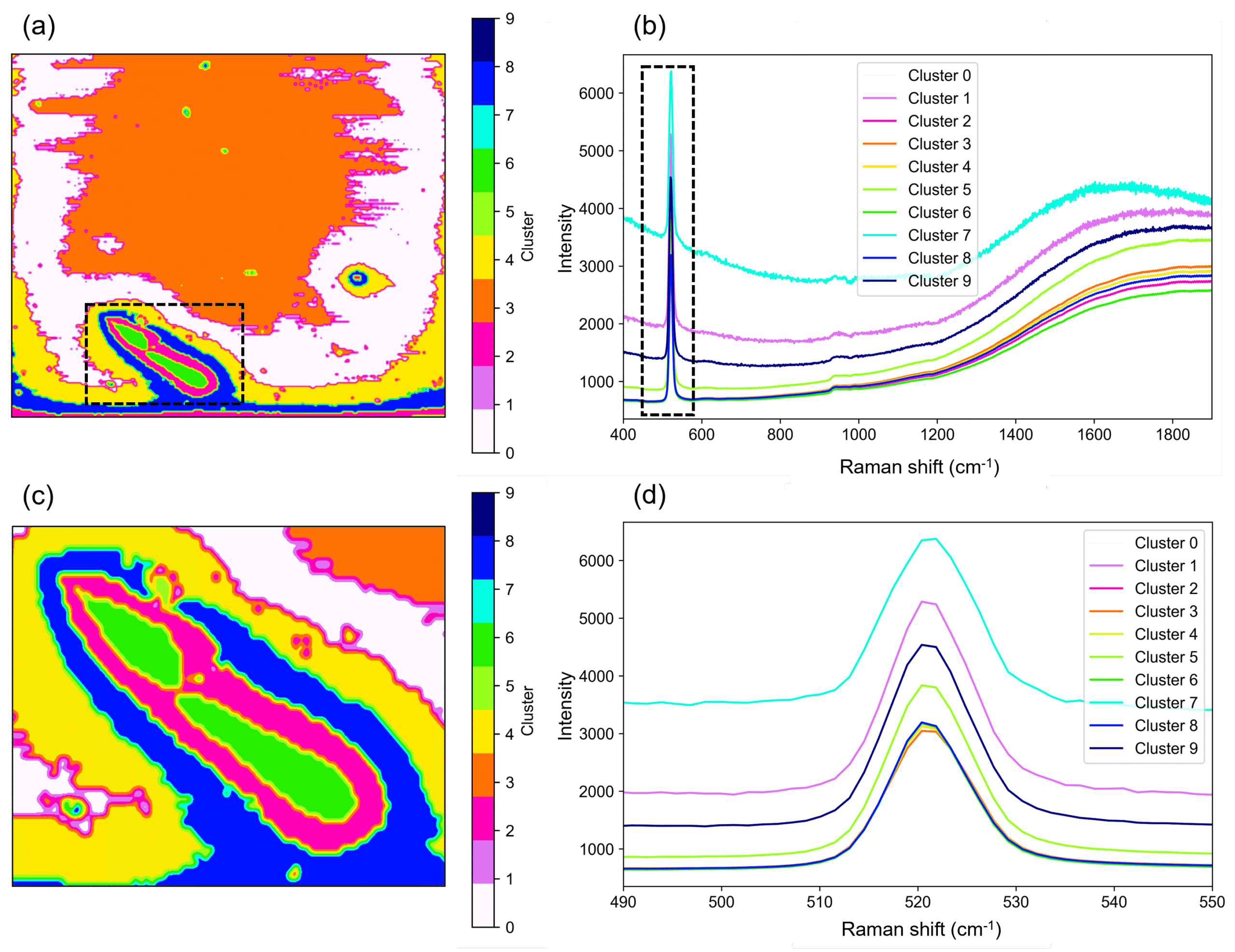 Figure 4. KMC imaging of the silicon wafer. (a) KMC image. (b) Mean spectra for each cluster. (c) Magnified view of the defect structure. (d) Magnified view of the Raman peak region.