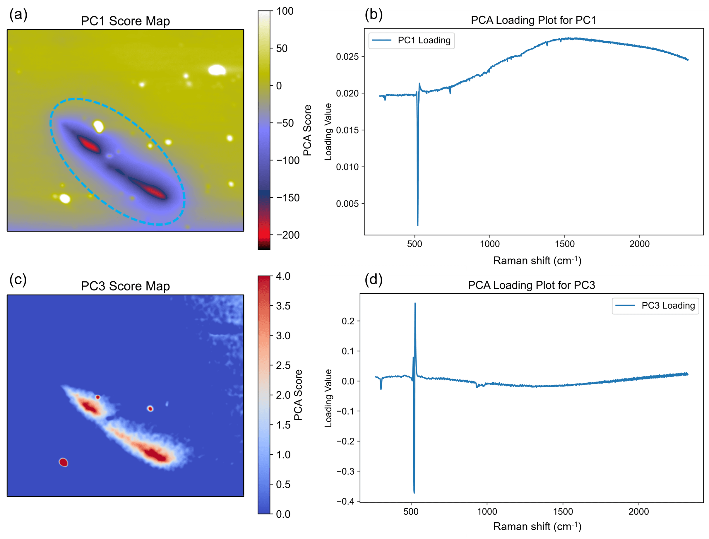 Figure 3. PCA imaging of the silicon wafer. (a) Score map and (b) loading vector plot for PC1. (c) Score map and (d) loading vector plot for PC3.