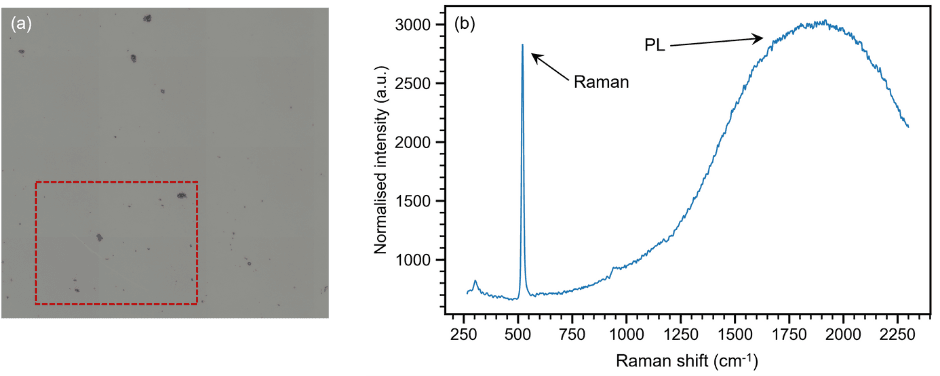 The region analysed on the wafer is shown in Figure 2a. An 830 nm laser was used with a 600 gr/mm grating, which meant that the dominant phonon mode at 520 cm-1 could be detected along with the broad PL band present in the Raman spectrum at ca. 1900 cm-1, as seen in Figure 2b.