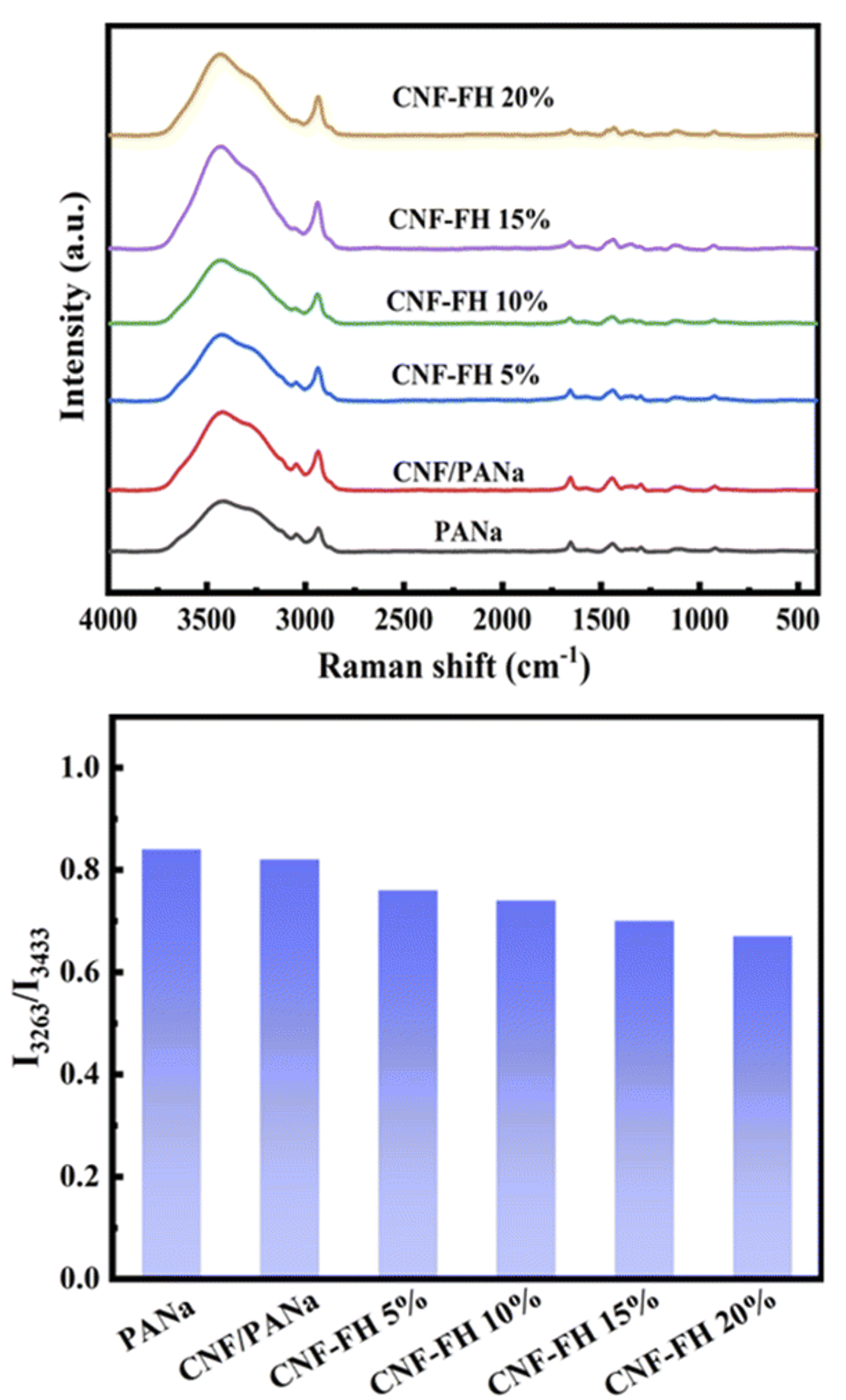 Figure 5. (a) Raman spectra of water in PANa, CNF/PANa, and CNF-FH structures and (b) peak intensity ratios of the symmetric and asymmetric OH stretching bands. The image is reprinted from Xue et al.2, Copyright (2022), with permission from the Royal Society of Chemistry.