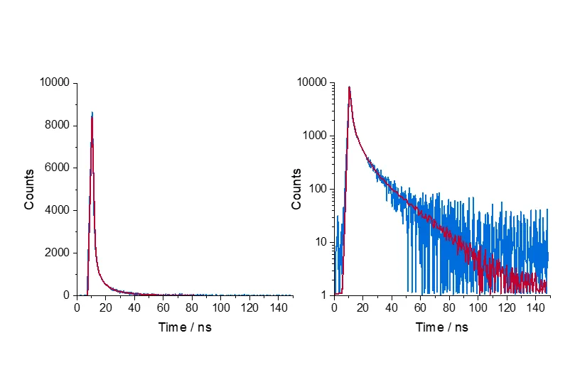 TCSPC is a time domain technique. Data is accumulated, presented, and analysed in a format showing signal intensity versus time, usually in picoseconds, nanoseconds, or microseconds. Exponential component analysis is used to fit the data to a user selectable number of components which can describe the decay. The fit is evaluated by examination of the residuals and the χ2 value. These components describe the fluorescence lifetimes of the emissive populations present in the sample. The presence of multi-exponential or more complex decay kinetics can be seen when viewed in a semi-logarithmic scale (Figure 1).